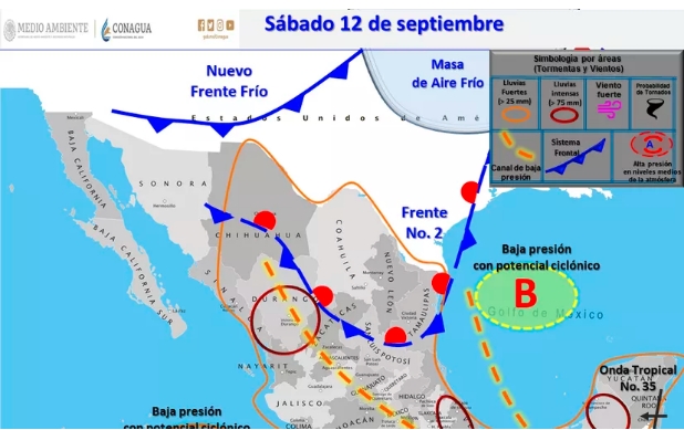 El Servicio Meteorológico Nacional pronostica lluvias muy fuertes con lluvias puntuales intensas (75 a 150 mm) acompañadas de descargas eléctricas, granizadas y rachas fuertes de viento durante las tormentas para Durango, Sinaloa, Nayarit, Jalisco, Tamaulipas, San Luis Potosí, Puebla, Veracruz y Oaxaca.