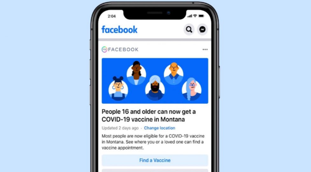 Esta notificación aparece de forma destacada en lo más alto del canal de noticias de cada internauta con el texto “Las personas mayores de 16 años ahora pueden recibir la vacuna contra el COVID-19 en” y anexará el nombre del lugar, seguida de dos enlaces: uno para buscar un lugar dónde recibir la vacuna y otro para compartir la información en el perfil de usuario.
