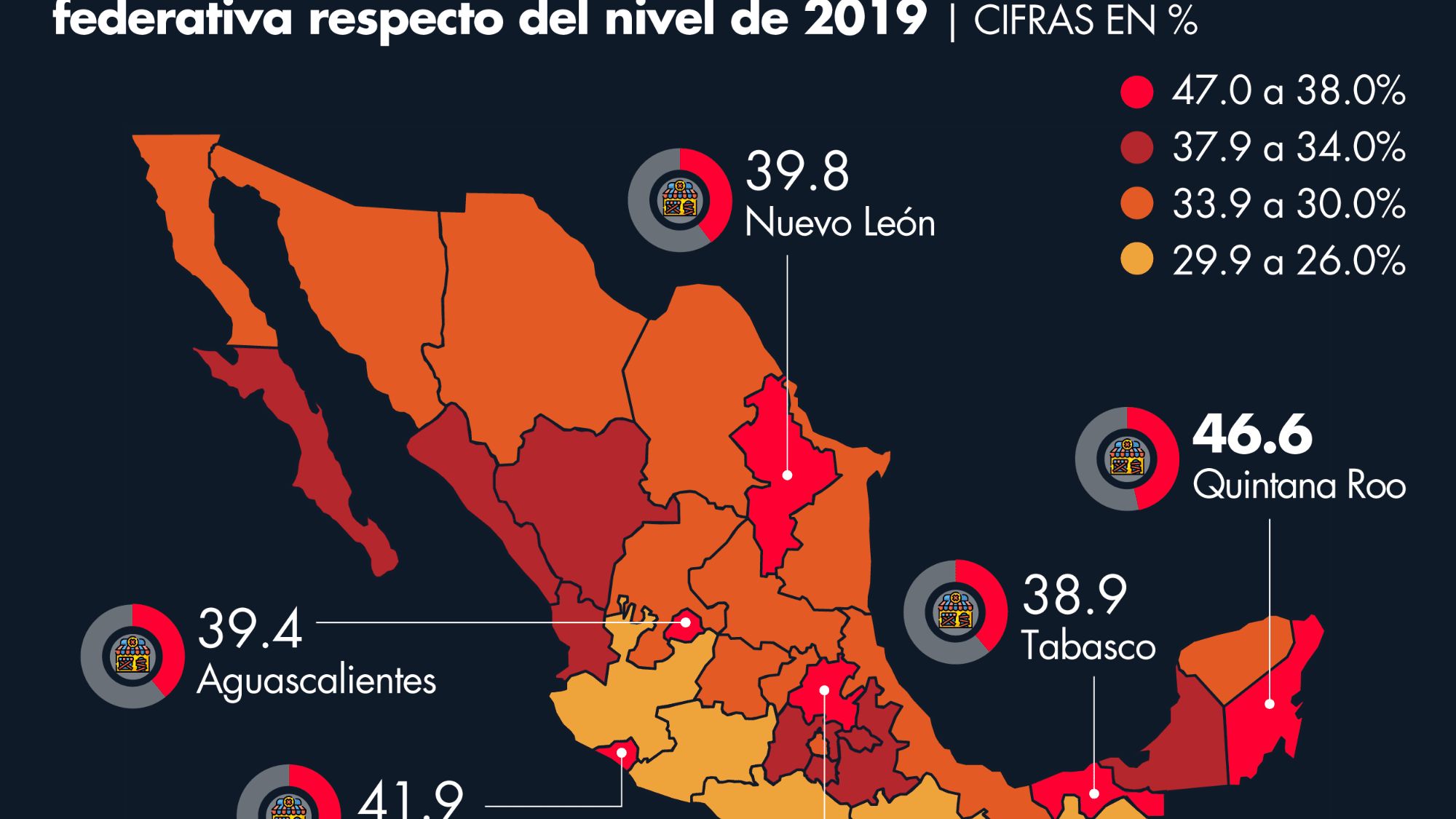 Al corte del 2021, Quintana Roo se mantiene como la entidad con la mayor proporción de negocios muertos a causa de la pandemia Covid-19. Cerca del 47% de los establecimientos que se tenían registrados durante el 2019. En contraparte, Chiapas es el estado que menos negocios perdió durante este lapso.