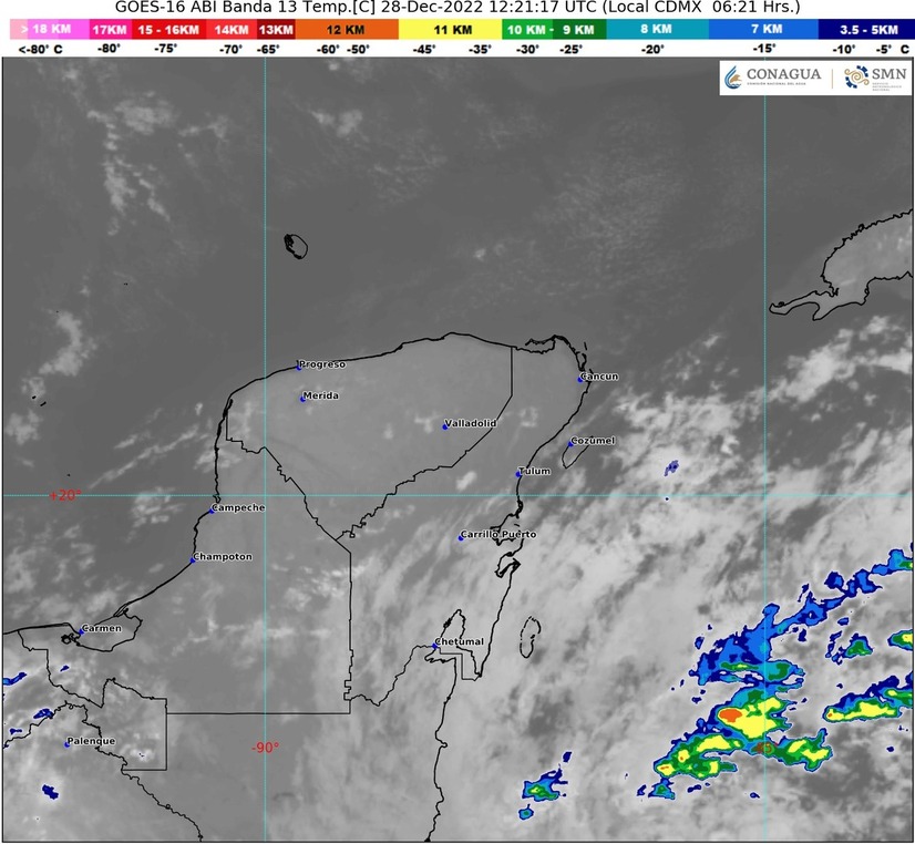 El cielo estará medio nublado a nublado la mayor parte del día, en la Península de Yucatán, con probabilidad de chubascos en Quintana Roo y lluvias aisladas en Campeche y Yucatán.