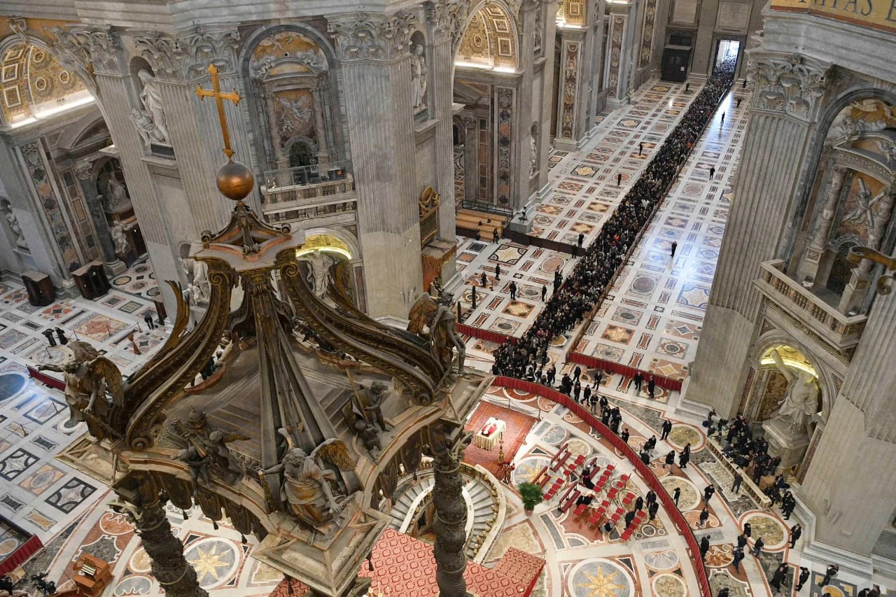 Ratzinger, que en 2013 fue el primer pontífice en renunciar en los últimos seis siglos, yacía sobre un catafalco de tela dorada a los pies del Altar de la Confesión y del baldaquino de Bernini, sobre el lugar en el que según la tradición fue sepultado San Pedro.