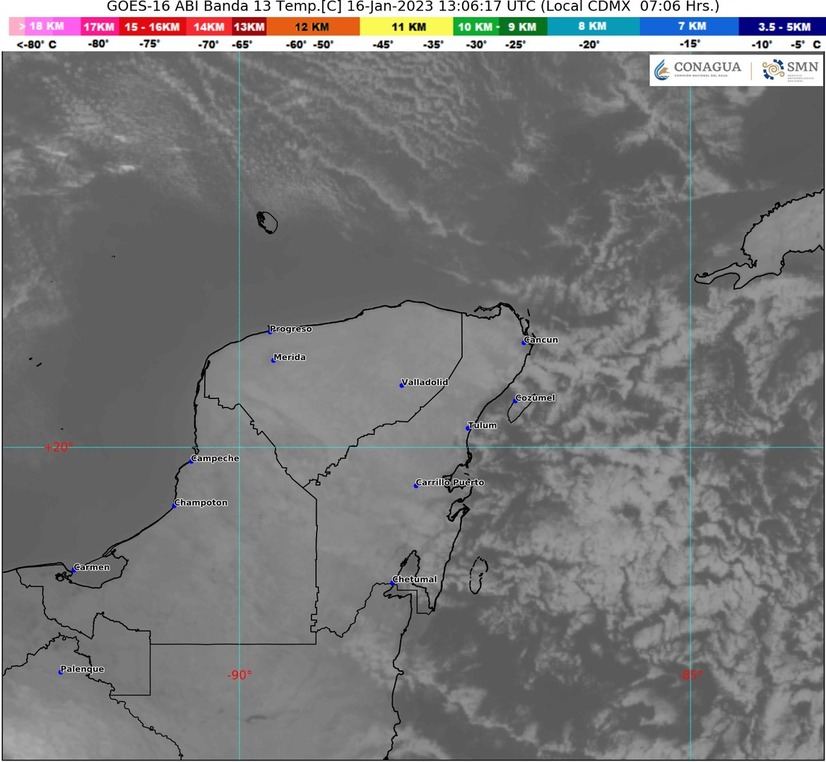 En la Península de Yucatán, el cielo estará despejado a medio nublado y sin lluvia en la región, donde el ambiente matutino será fresco a templado; por la tarde será cálido. Soplará viento del sur y sureste de 10 a 25 km/h en la región, con rachas de 50 a 70 km/h en Campeche y Yucatán.