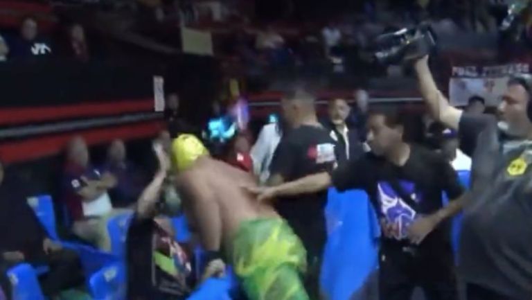 Al final la seguridad del recinto sacó al hombre que le aventó cerveza al luchador y la estelar de la cartelera pudo continuar.