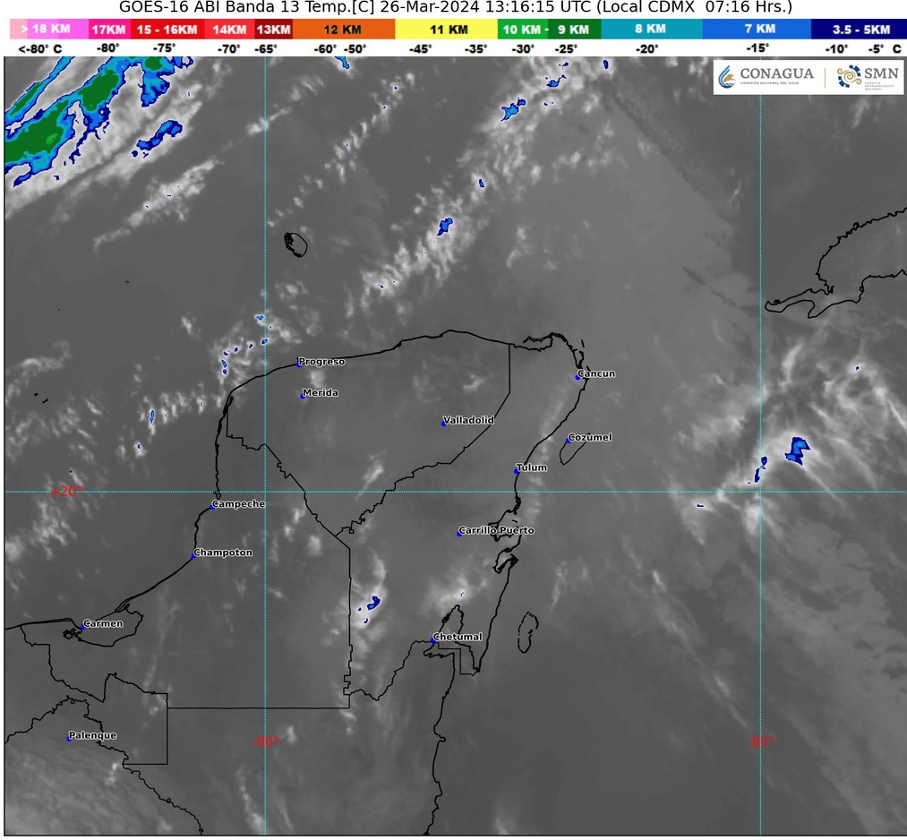 Para la Península de Yucatán, se espera cielo medio nublado a nublado con intervalos de chubascos, descargas eléctricas y posible caída de granizo en la región. El ambiente será templado por la mañana y muy caluroso a extremadamente caluroso durante la tarde, con vientos de dirección variable de 15 a 30 km/h y ráfagas de 40 a 60 km/h.