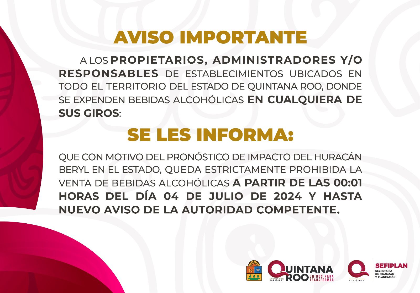 Chetumal.- Debido a la contingencia hidrometeorológica generada por el paso del huracán “Beryl” en el estado y con la finalidad de salvaguardar el orden y como parte de las acciones de prevención hacia la población, la gobernadora Mara Lezama Espinosa a través de la Secretaría de Finanzas y Planeación (SEFIPLAN), ha dispuesto la prohibición de la venta de bebidas alcohólicas en todo el estado a partir de las 00:01 horas del día jueves 04 de julio de 2024 y hasta que la autoridad pertinente así lo determine.