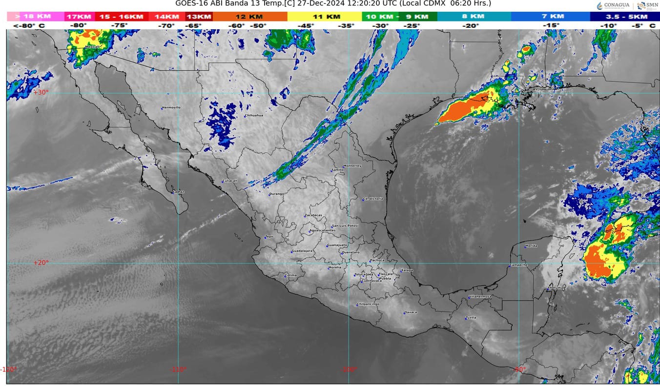 En la Península de Yucatán, el cielo estará nublado la mayor parte del día, con probabilidad de lluvias e intervalos de chubascos, acompañados con descargas eléctricas en la región. El ambiente será templado a fresco en zonas de Campeche y Yucatán; por la tarde, cálido a caluroso, con viento de dirección variable de 20 a 30 kilómetros por hora y rachas de 40 a 60 en Campeche y Yucatán.