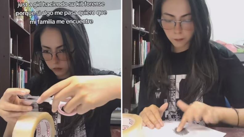 “Just a girl (sólo una chica) haciendo su kit forense porque si algo me pasa, quiero que mi familia me encuentre”, escribió en el video, donde se le observa guardando sus huellas digitales utilizando grafito y cinta adhesiva, junto con otros elementos de identificación.