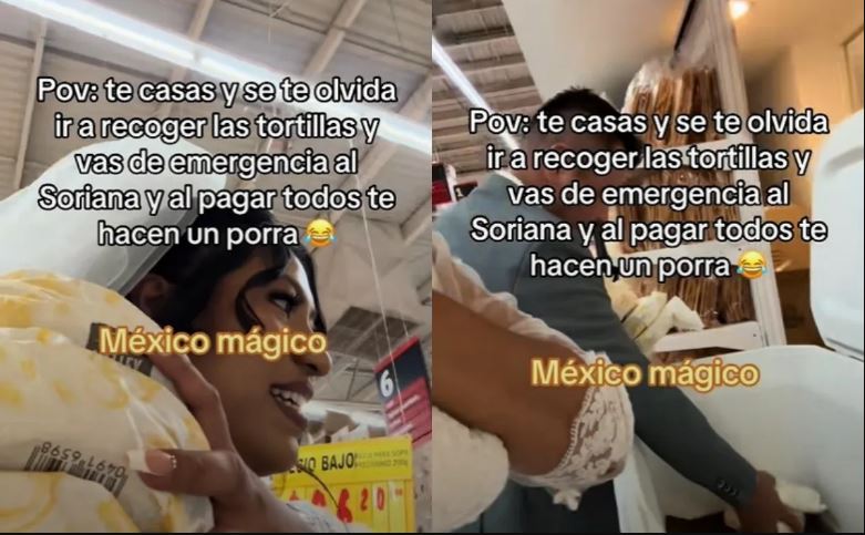 La escena fue compartida por la usuaria @karlaesquivel420, quien documentó el curioso episodio que marcó su boda. En el clip se puede leer: “POV: Te casas y se te olvida ir a recoger las tortillas y vas de emergencia al Soriana y al pagar todos te hacen una porra”. En las imágenes se observa a Karla, vestida de blanco, acompañada de su esposo con traje formal, mientras recorren el supermercado en busca del esencial acompañamiento para la cena.