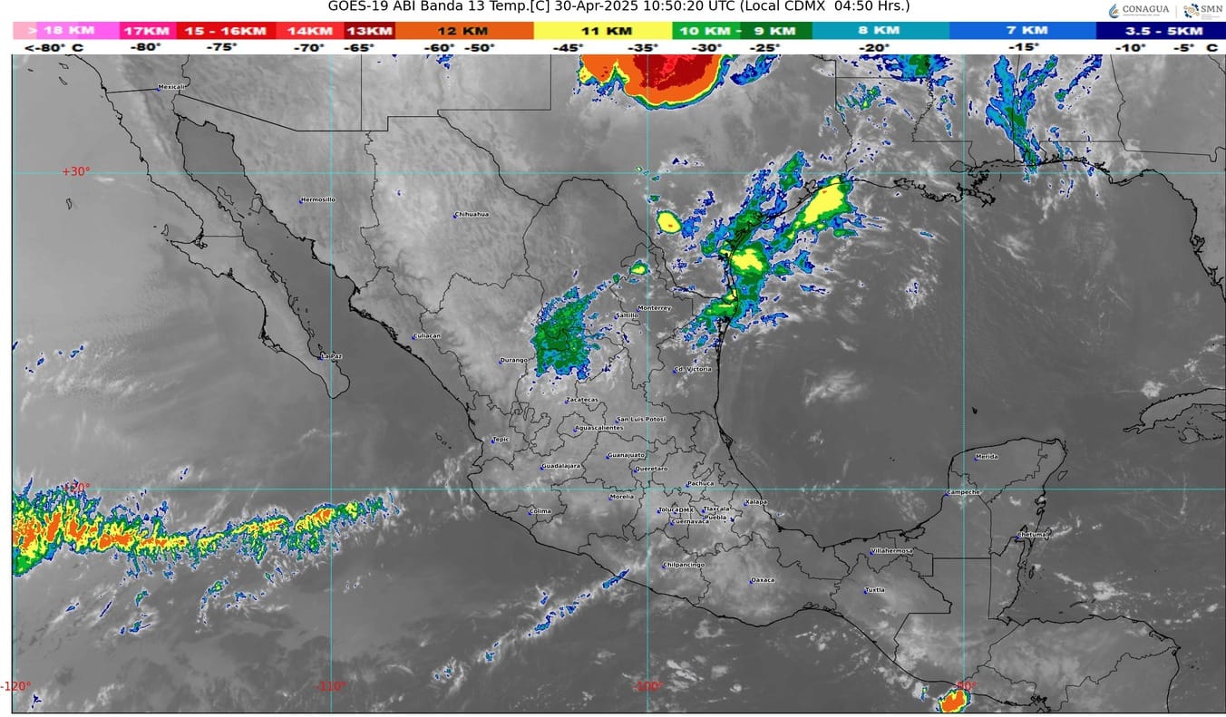 Finalmente, una circulación anticiclónica en niveles medios de la atmósfera mantendrá ambiente caluroso a muy caluroso en la República Mexicana. Asimismo, prevalecerá la onda de calor en Jalisco (centro, sur y suroeste), Colima (este y noreste), Michoacán (oeste, suroeste, centro y sureste), Guerrero (noroeste, norte, sur y sureste), Oaxaca (suroeste y sur), Chiapas (oeste) y Morelos.