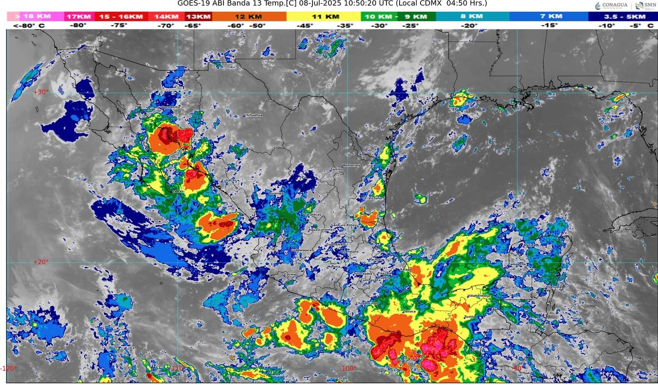 Por otro lado, un canal de baja presión sobre la Mesa del Norte y la Mesa Central y otro canal de baja presión sobre el oriente del país, interaccionarán con una circulación ciclónica en altura sobre el noreste del territorio nacional, con inestabilidad atmosférica y con el ingreso de aire húmedo del océano Pacífico y golfo de México.