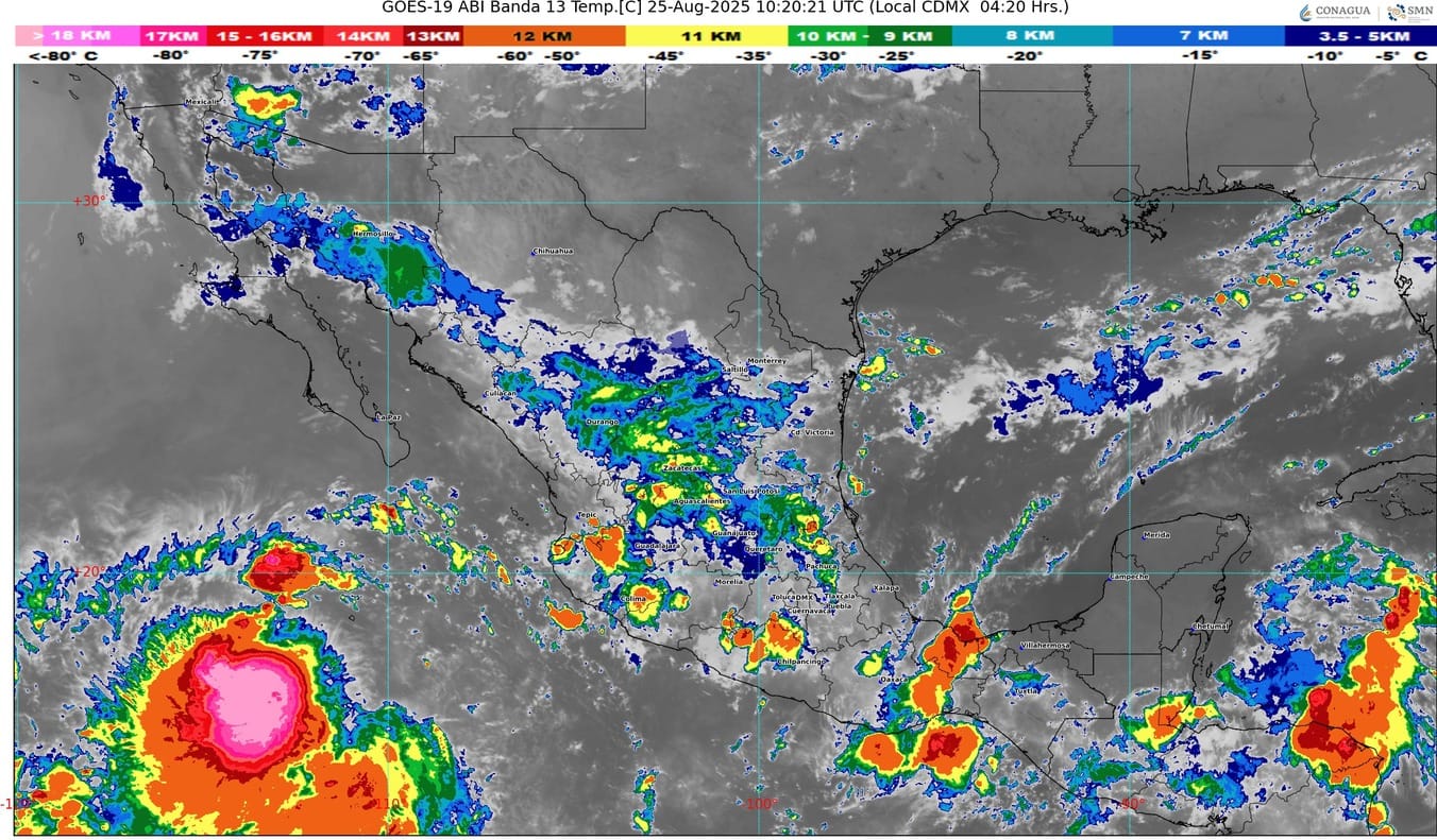 El paso de onda tropical número. 25 sobre el sur del territorio nacional originará lluvias puntuales muy fuertes en Guerrero y el flujo de aire húmedo del océano Pacífico, ocasionará lluvias puntuales intensas en Jalisco; y puntuales muy fuertes en Michoacán y Colima.