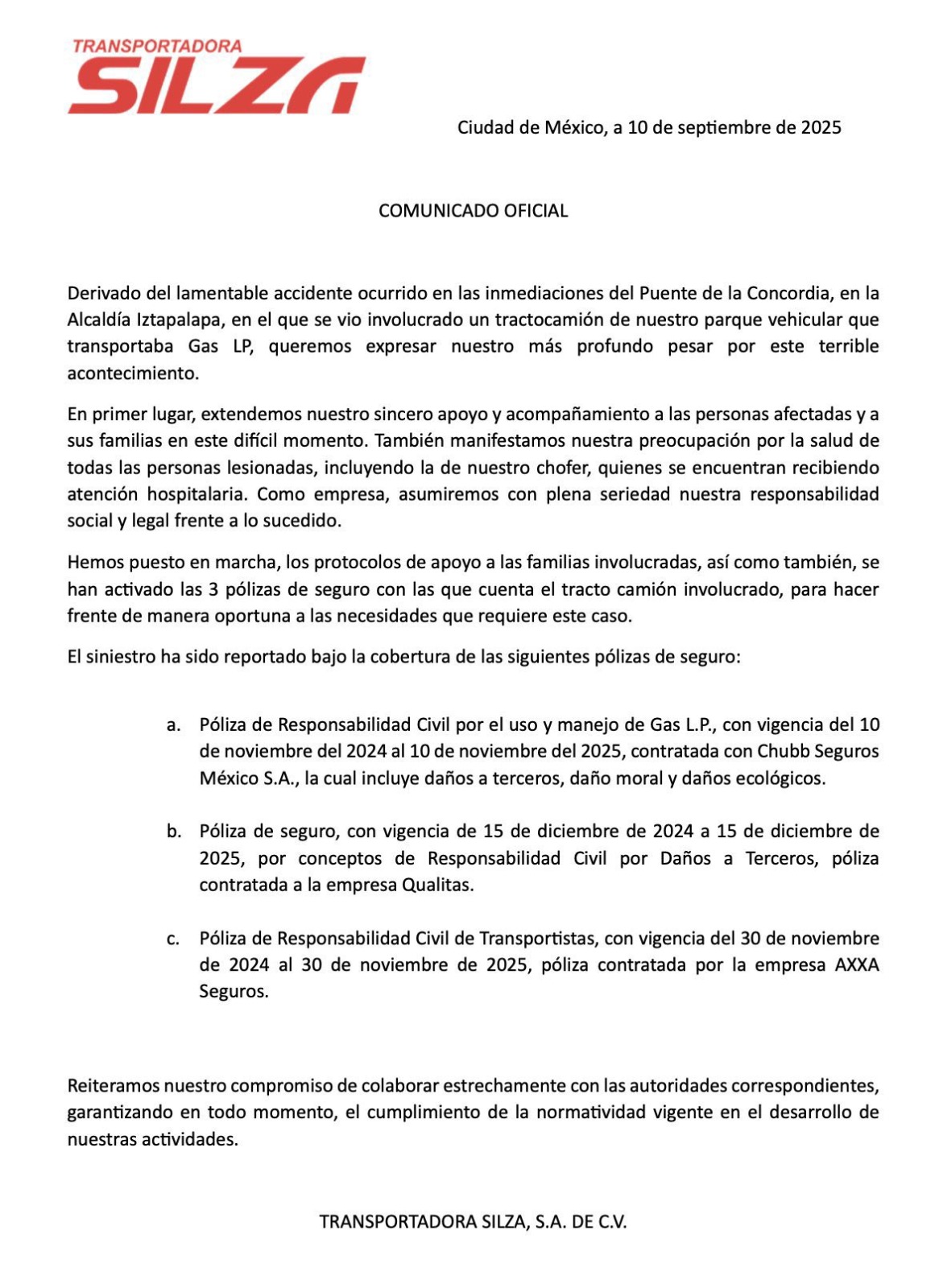 Transportadora Silza indicó que ya puso en marcha los protocolos de apoyo a las familias de las víctimas, en tanto que se activaron las tres pólizas de seguro con las que cuenta el tractocamión involucrado.