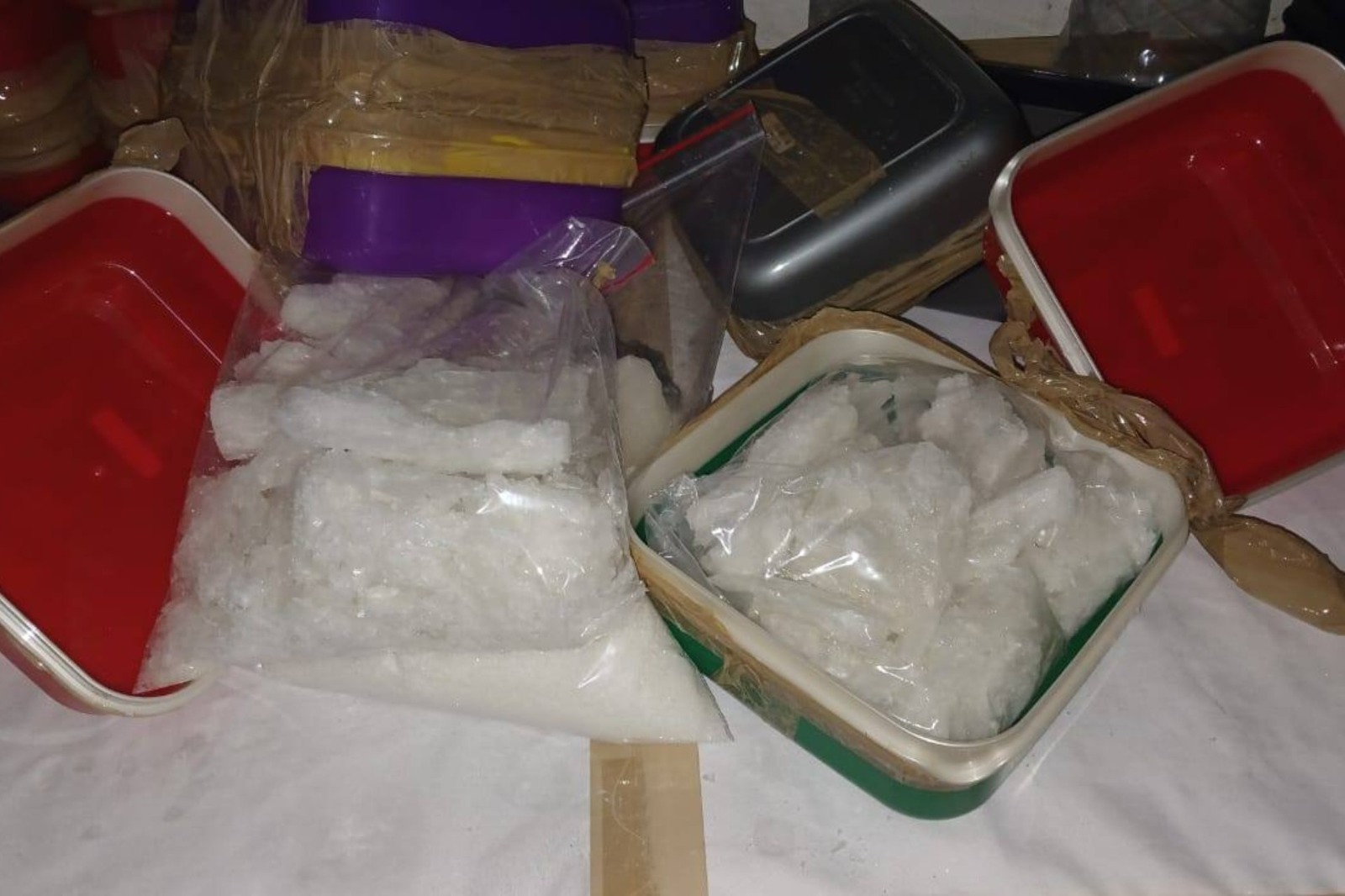 Metanfetamina valorada en aproximadamente 350 millones de rands (unos 20.2 millones de dólares), empaquetada en loncheras y cubos almacenados en congeladores.