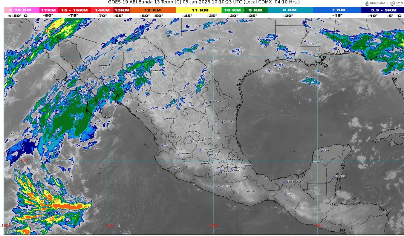 Por otra parte, una circulación anticiclónica en niveles medios de la atmósfera mantendrá cielo despejado y baja probabilidad de lluvia sobre el resto de la República Mexicana.